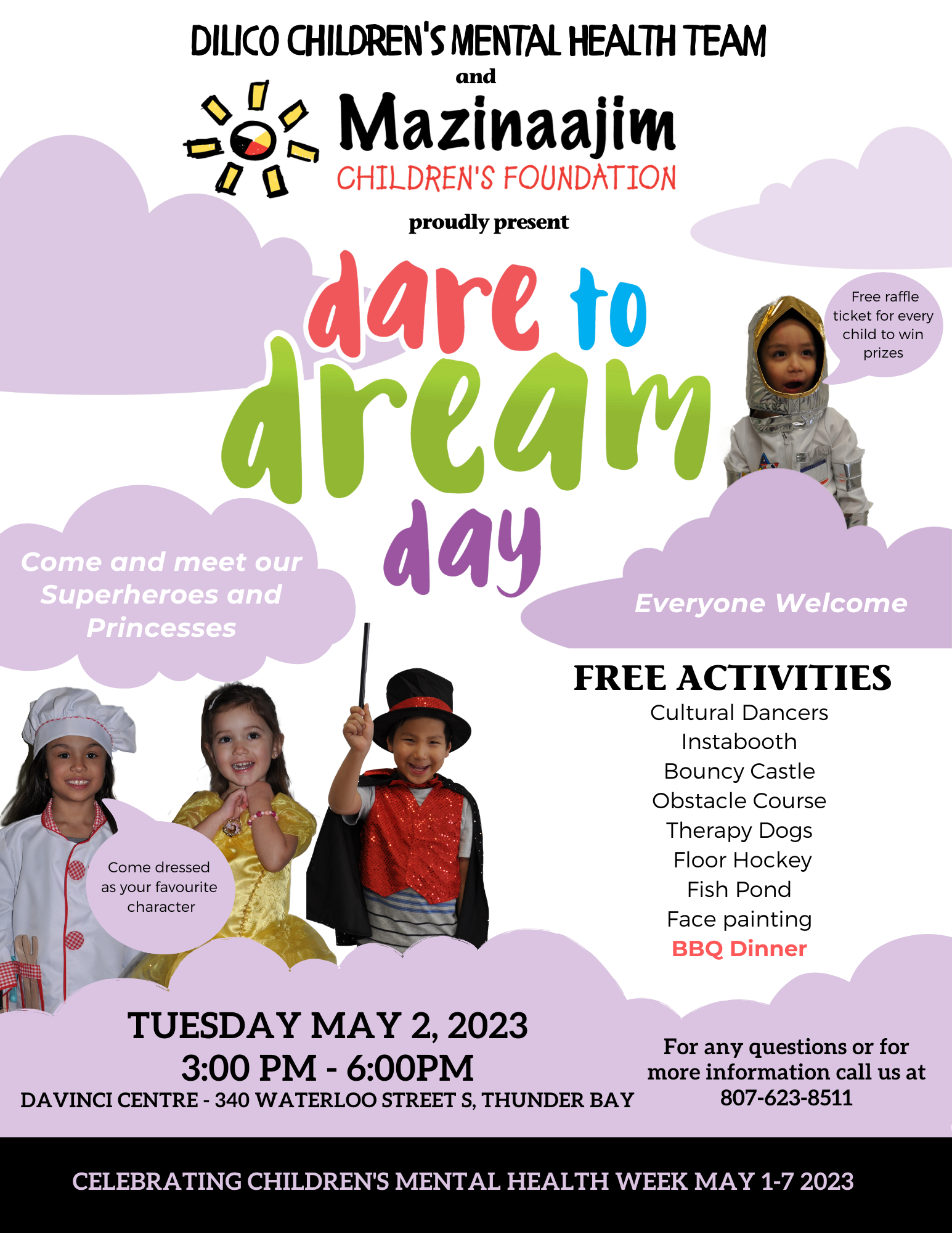 Dilico Children’s Mental Health Team and Mazinaajim Children’s Foundation are hosting an event for Young Imaginations. The 5th Annual Dare to Dream Day is a free fun filled event for children and their families. Children will get to visit and interact with a number of fun and exciting booths and experience a variety of hands on activities. Children will have a chance to meet and talk with many different Superheroes and Princesses, take fun photos, and enjoy a free BBQ dinner.