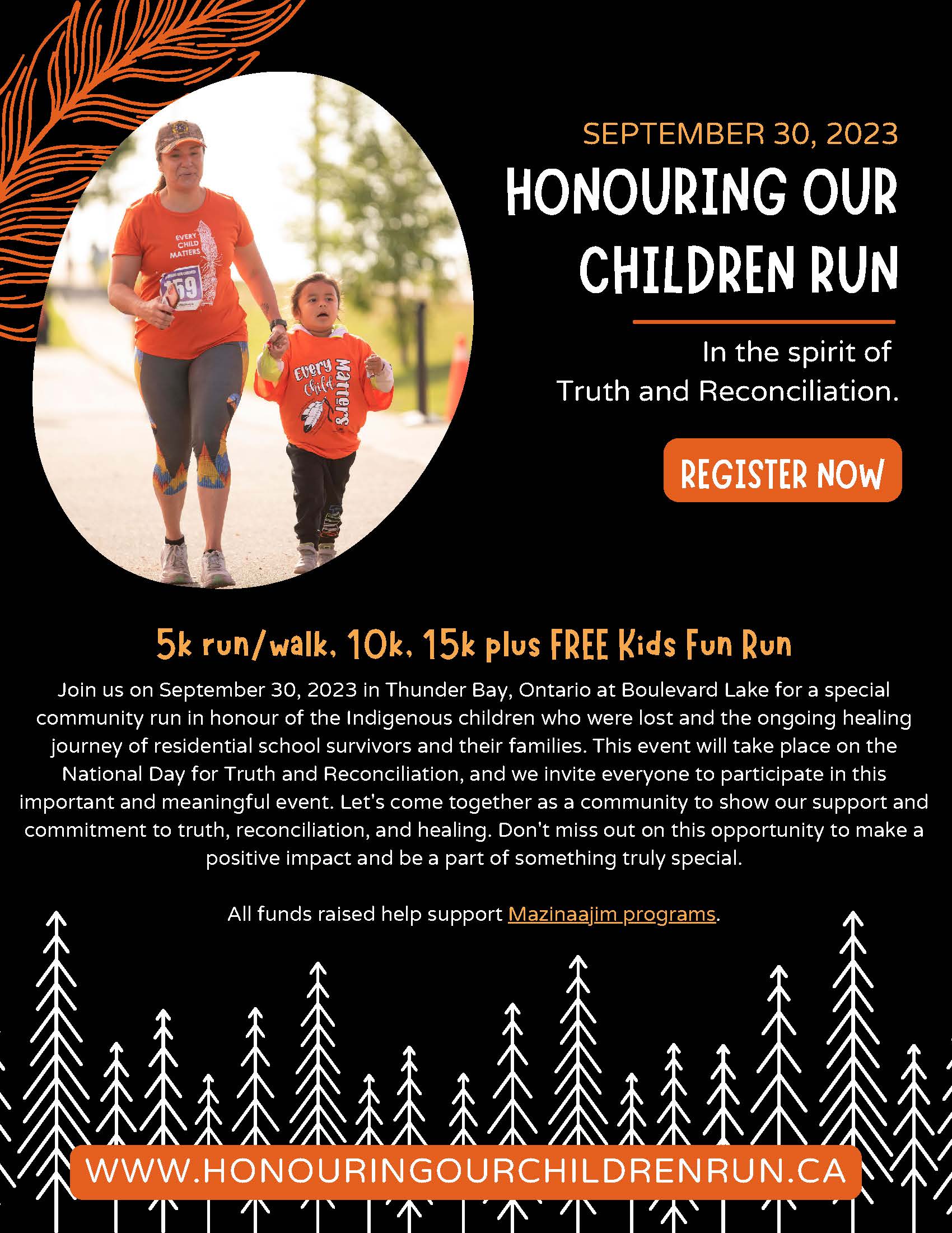 Join us on September 30, 2023 in Thunder Bay, Ontario at Boulevard Lake for a special community run in honour of the Indigenous children who were lost and the ongoing healing journey of residential school survivors and their families. This event will take place on the National Day for Truth and Reconciliation, and we invite everyone to participate in this important and meaningful event. Let’s come together as a community to show our support and commitment to truth, reconciliation, and healing. Don’t miss out on this opportunity to make a positive impact and be a part of something truly special.