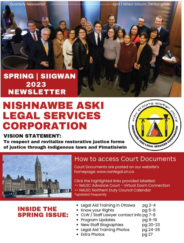 Below you will find Nishnawbe-Aski Legal Services Corporation Spring 2023 Newsletter. Inside you will find Program updates, training from Legal Aid Program, new staff Bio’s, information about Duty Council, Community Legal Worker contact sheet, and lots of photos and other information. Please click the link below to read
