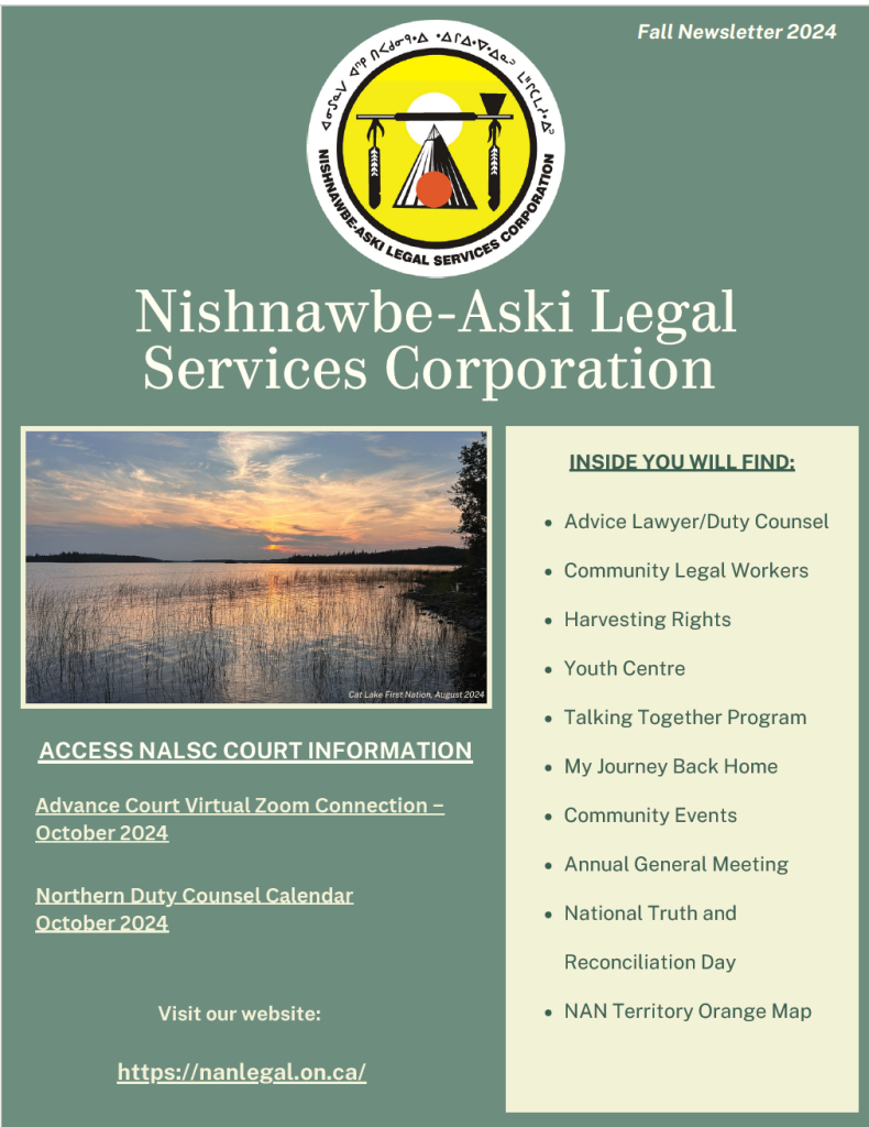 Below is our Nishnawbe-Aski Legal Services Corporation Fall 2024 Newsletter.  Inside you will find what our updated Legal Aid contact information, what our Programs have been up to, community events and visits, AGM peek, and numerous photos. Click below to read: