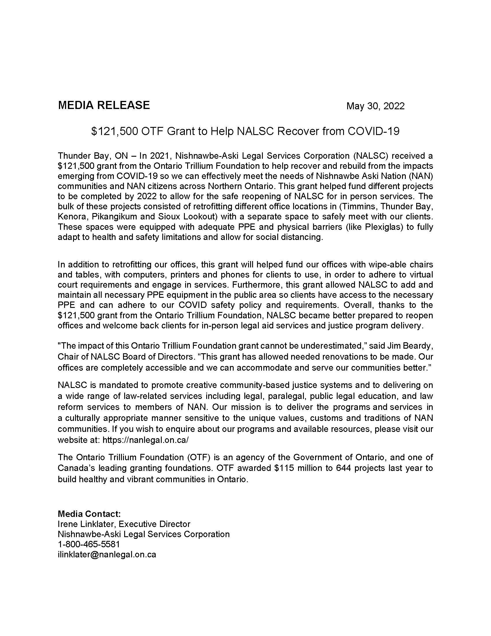 Ontario Trillium Grant to Help NALSC Recover from COVID-19