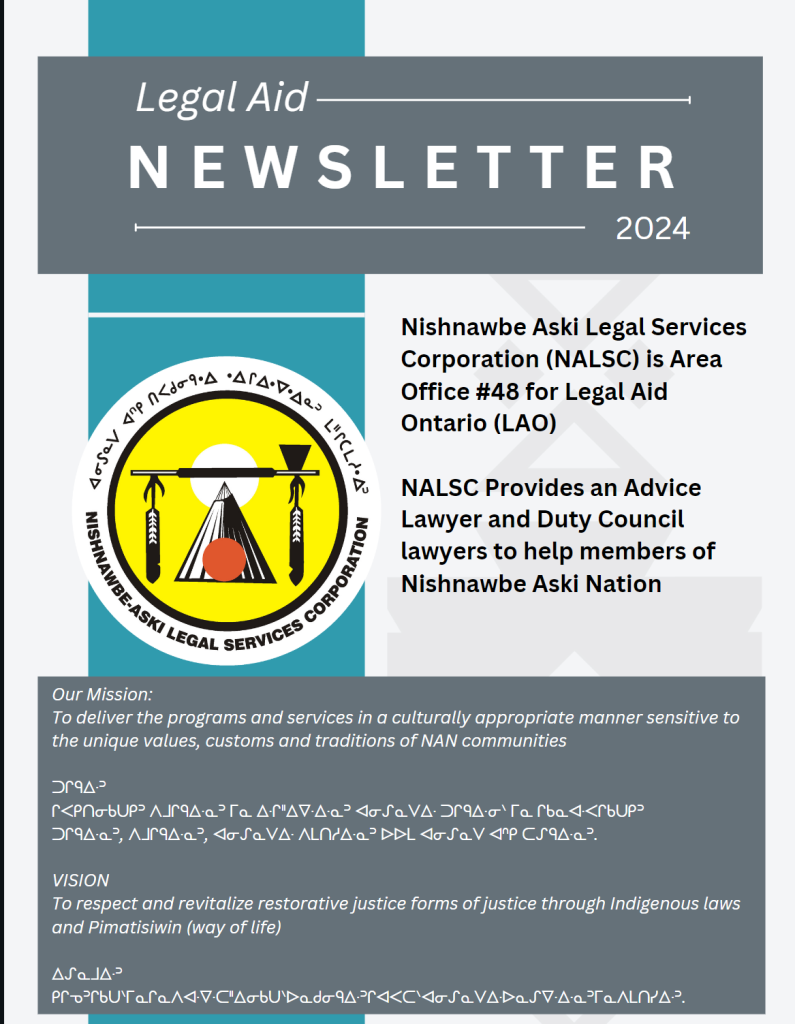Below you will find Nishnawbe-Aski Legal Services Corporation LEGAL AID PROGRAM Newsletter 2024. Inside you will find Program Information, staff bio’s, lawyers panels, and other helpful legal information. Please click the link below to read: