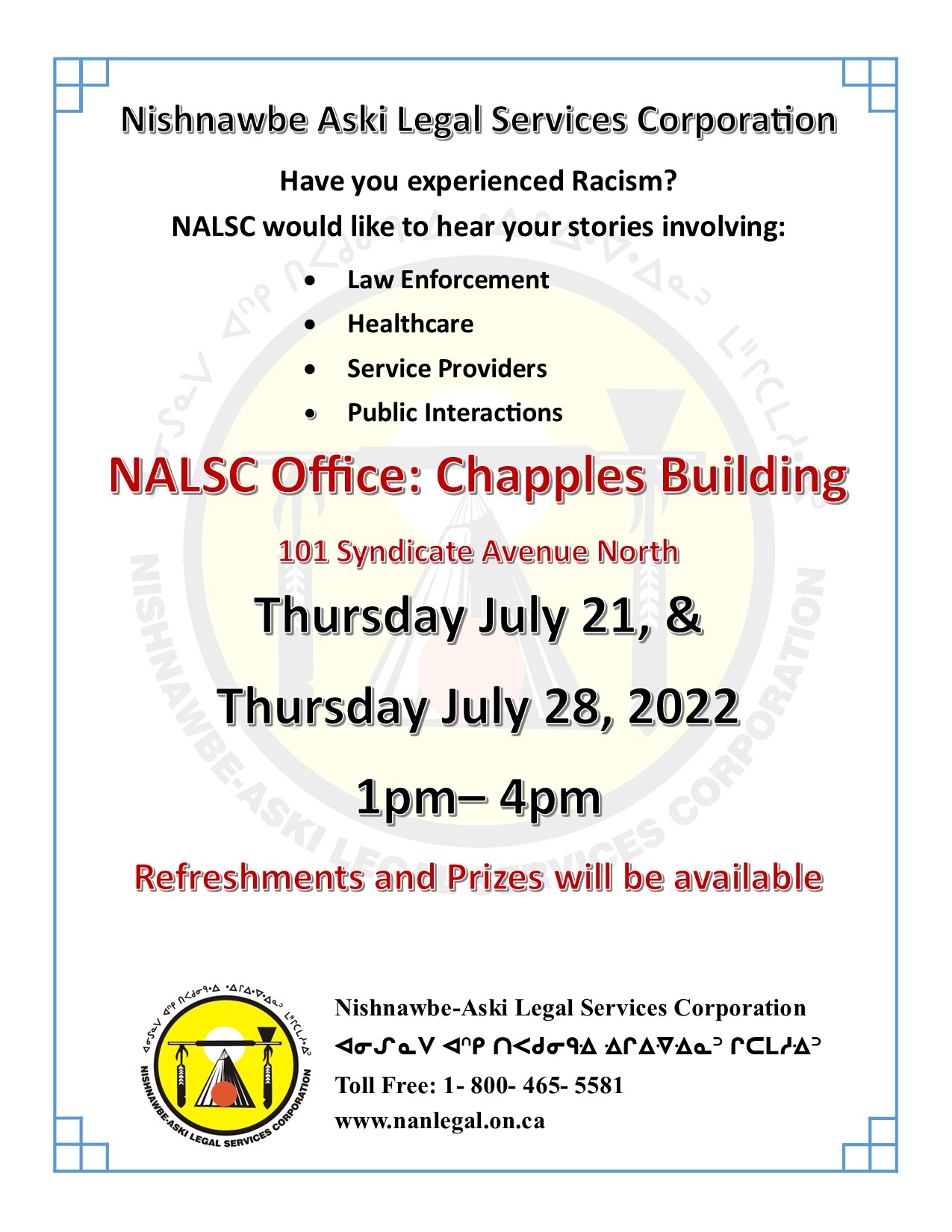 On Thursday July 21st and July 28th NALSC will have open house/ drop in at the Chapple’s Building, from 1pm- 4pm