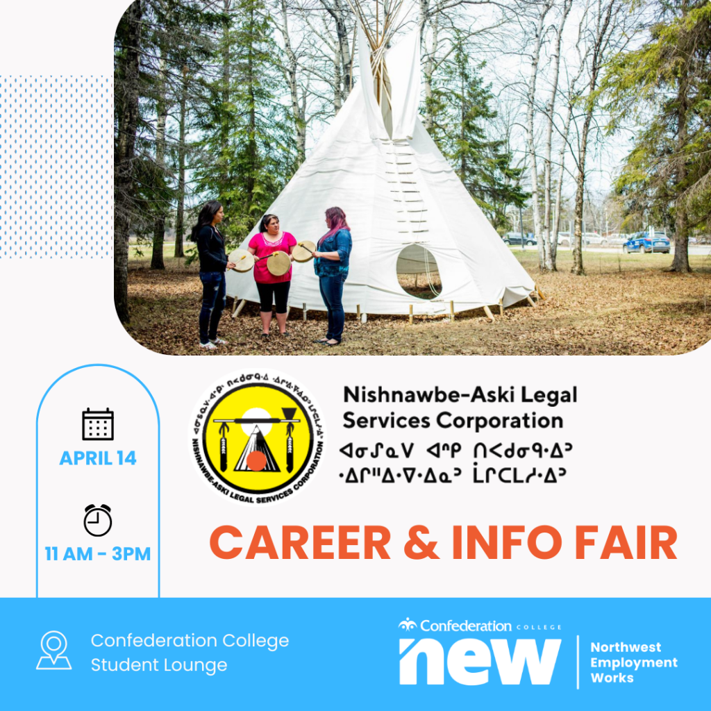 Nishawbe Aski Legal Services will be hosting their very own in- person “Career and Information Day.” The event will be at Confederation College, on Friday April 14th, 2023, from 11am until 3pm. We will be located in front of the SUCCI Office, Student Common Area, on the main floor. Adjacent to the NALSC Career & Information Fair, there is the APIWIN Education Centre, where Indigenous Students have access to a variety of support and academic service. We hope to see you there!