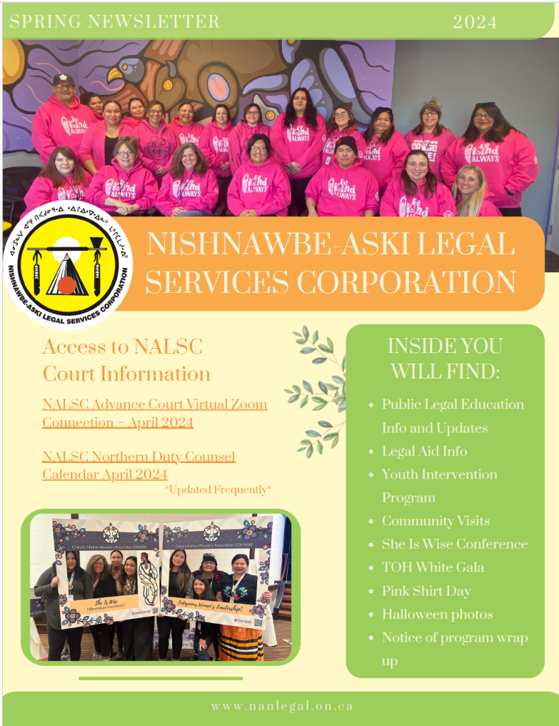 Below you will find Nishnawbe-Aski Legal Services Corporation Spring 2024 Newsletter.  Inside you will find some Program updates and what they have been up to, community visits, helpful legal information and contact information. Please click the link below to read: