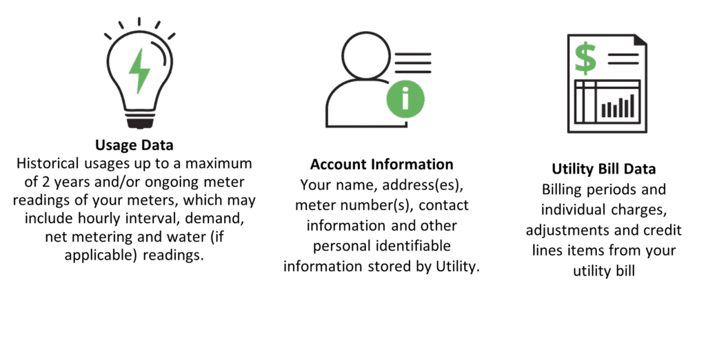 When authorizing a third-party vendor to access your data, you will select the type of data you want to share with them and for which account (if you have multiple accounts). You can select your Energy Usage Data, Billing Data and/or Account Information to be shared. Your utility provider will share the type of data you have selected and authorized for that account.